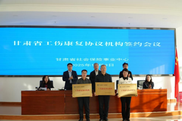 在全场见证下,省社保中心副主任姚红军同志与我院院长谢伟同志共同签署《甘肃省工伤保险康复机构服务协议》。省社保中心主任向东同志给省矿泉康复医院授予“工伤康复协议机构”牌匾,现场掌声热烈。